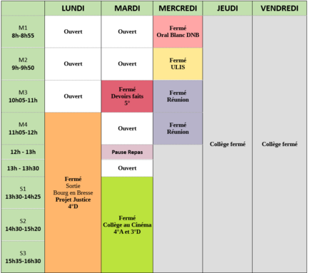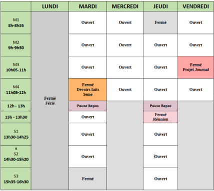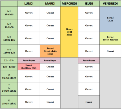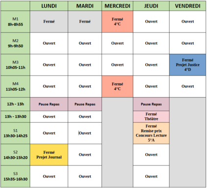 Publié le lundi 2 juin 2025 08:21 - Mis à jour le lundi 2 juin 2025 08:21Voici l'emploi du temps de la semaine du 02 juin au CDI. Pour rappel, les prêts sont arrêtés depuis le 28 mai, tous les documents doivent être rendu avant le 10 juin. -